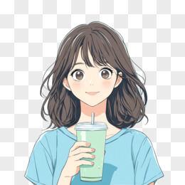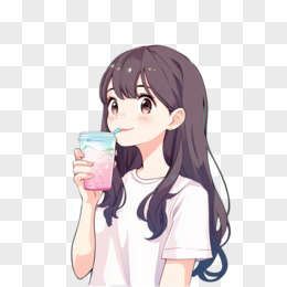卡通一个小女孩抱着一个有吸管的水杯在喝饮料免抠元素