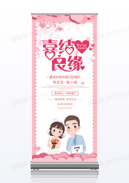 粉色简约浪漫婚庆主题喜结良缘卡通艺术字易拉宝