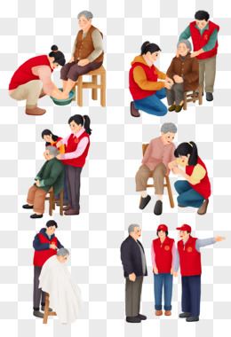 一组手绘插画风志愿者献爱心帮助老人免抠元素