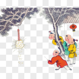 手绘大人贴春联小孩放鞭炮场景插画元素