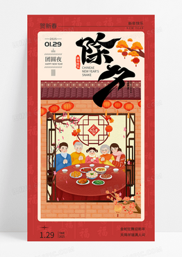 福字底纹除夕年夜饭团圆饭蛇年新春海报