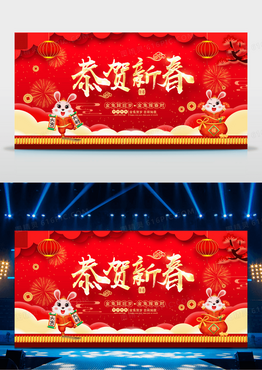 红色恭贺新春恭贺新年2023年恭贺新年兔年展板春节剪纸