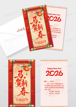 红色国潮喜庆卷轴2026马贺新春马年贺卡