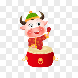 卡通手绘新年牛牛敲鼓庆祝免抠元素