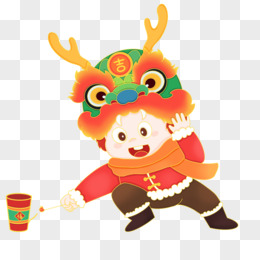 手绘矢量卡通小男孩舞狮免抠元素