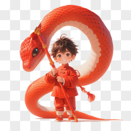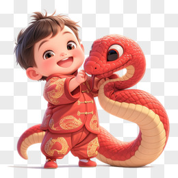简笔插画新年小男孩和红色蛇亲昵免抠元素