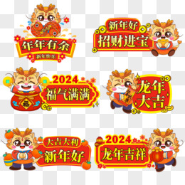 一组矢量2024新年龙年手举牌合集元素一