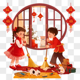 插画新年习俗两个小孩在门前扫雪免抠元素