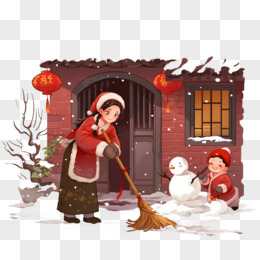 插画新年习俗妈妈和孩子在门前扫雪免抠元素