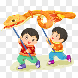 卡通手绘小女孩和舞狮子的人玩耍免抠元素