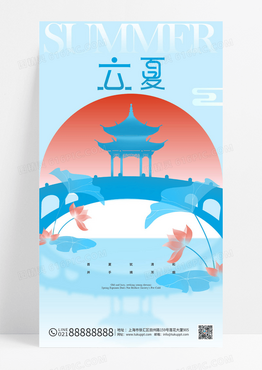 蓝色立夏24节气新中式荷花简约海报