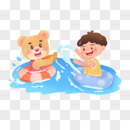 卡通手绘动物小熊和小孩一起玩水