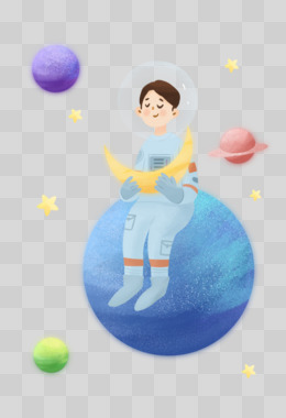 手绘梦幻插画风治愈系坐在星球上的宇航员元素