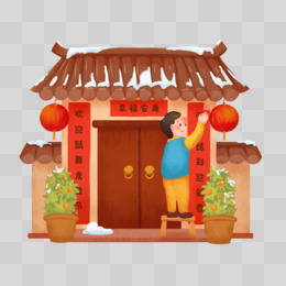 手绘卡通新年大人贴春联小孩们玩耍场景免抠素材