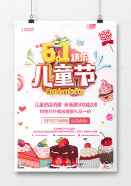 玫红色甜品草莓雪糕棒棒糖甜美简约风欢乐六一儿童节海报
