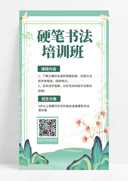 青色国潮中国风学习书法培训班手机海报硬笔书法