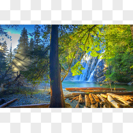 绿色树林瀑布阳光
