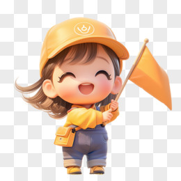 3D卡通戴黄色帽子拿着小黄旗的女性导游形象免抠元素