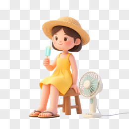 卡通小男孩拿着冰棍坐在椅子上吹风扇解暑免抠元素