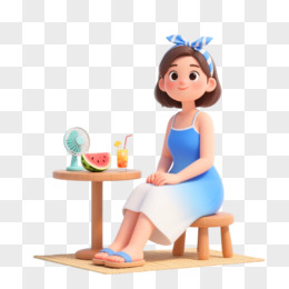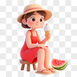 吹风扇的小女孩吃西瓜夏日消暑免抠元素