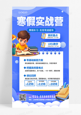 蓝色放寒假补习班一对一一对多高效补习快乐寒假手机海报模版