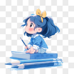 卡通风开学季一个蓝衣女孩坐在书上免抠元素
