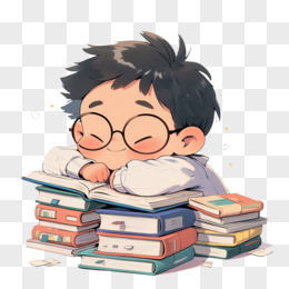 卡通风开学季一个小男孩趴在一摞书上免抠元素