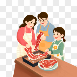 一家人腌腊肉腌肉温馨年味儿小场景插画免抠元素