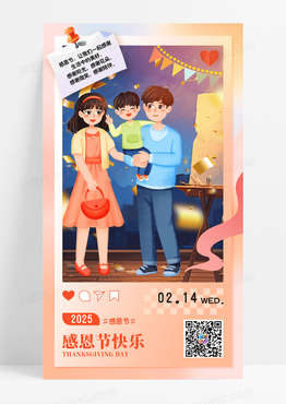 粉色插画感恩节快乐感恩节家庭插画一家三口温馨海报海报素材