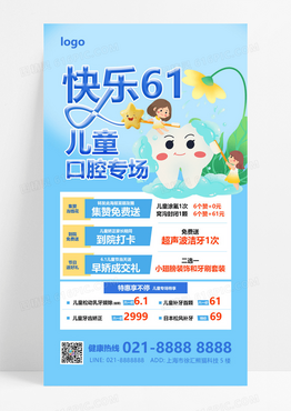 大气蓝色创意弥撒风儿童口腔文案海报孩子61儿童节手机牙齿健康海报