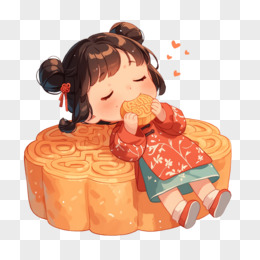 插画中秋小女孩倚着大月饼吃月饼免抠元素