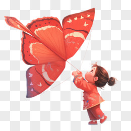 3D卡通小女孩放红色的蝴蝶风筝免抠元素
