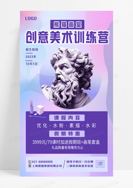 简约蓝紫色创意暑假班美术训练营美术培训招生手机文案海报