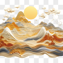 鎏金风格山水画山脉湖泊和小船免抠元素