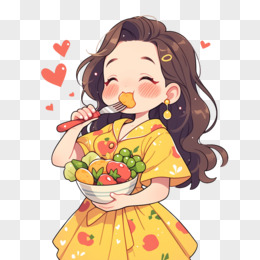 卡通穿黄裙的女孩在吃水果免抠元素