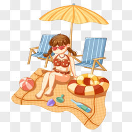 手绘卡通穿女孩晒日光浴场景素材