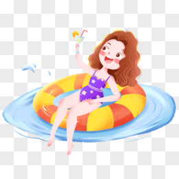 手绘插画风女孩坐在救生圈上玩水免抠素材