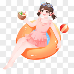 卡通手绘免抠戴游泳圈的女孩素材
