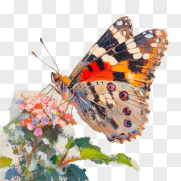 油画风花朵上的蝴蝶免抠元素