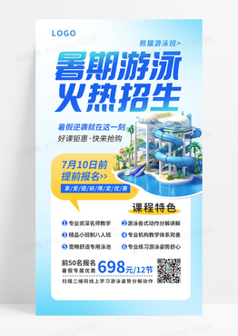 蓝色C4D暑假游泳班火热招生3D手机文案海报暑假班招生