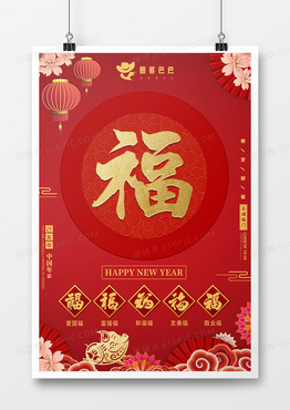 2019年猪年新年集五福喜庆大气风格海报设计