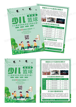 浅绿色卡通手绘少儿篮球培训班篮球宣传单