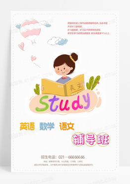 可爱卡通风格英语数学语文学习辅导班招生海报