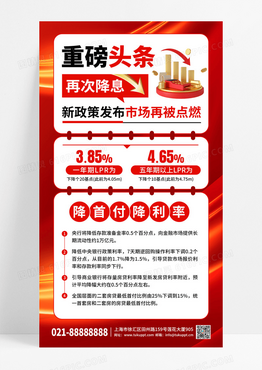 红色房地产重磅头条再次降息手机宣传海报