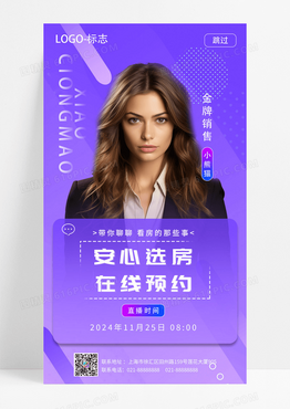 紫色简约安心选房在线预约在线直播uih5手机海报线线上宣传直播