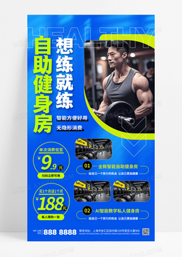 蓝色简约自助健身房运动健身减脂增肌促销海报