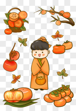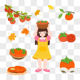 一组卡通手绘可爱秋天女孩摘柿子贴纸合集元素