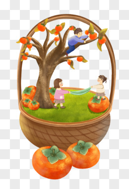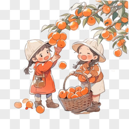 手绘卡通孙子孙女帮奶奶摘柿子场景免抠元素