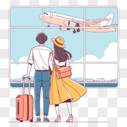 插画一对年轻夫妇站着窗边外面飞机飞过在看地图免抠元素