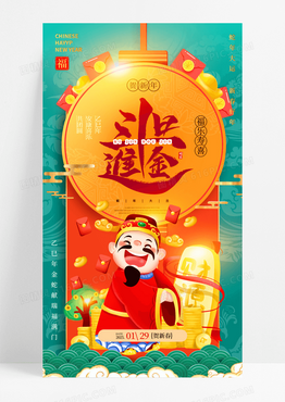橙色绿色中国风2025斗日金进贺新年贺新春元宝恭喜发财